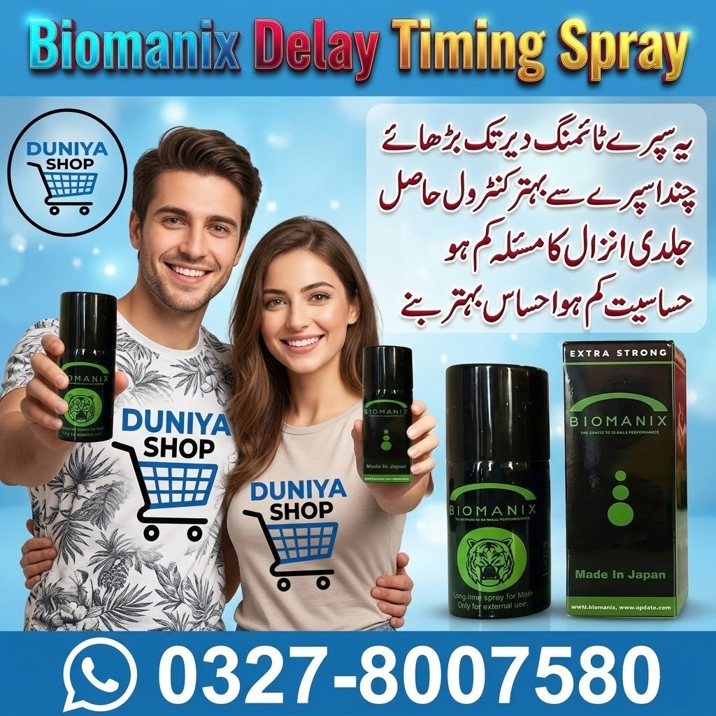 Apni timing aur mardana stamina ko Biomanix Delay Timing Spray ke sath naye sire se jagayein. Yeh premium spray jald farigh hona rok kar aap ko be-panah control deta hai. Aaj hi check karein behtareen price in Pakistan aur original product mangwayein. For order now contact on this number: 0327-8007580